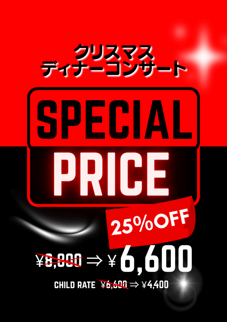 日ごろの感謝を込めて、 クリスマスディナーコンサート特別価格のご案内です。 大人は8,800円⇒6,600円(税込み) 子供は6,600円⇒4,400円(税込み) 2025年12月6日(土) 2025年12月13日(土) […]